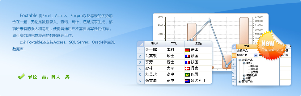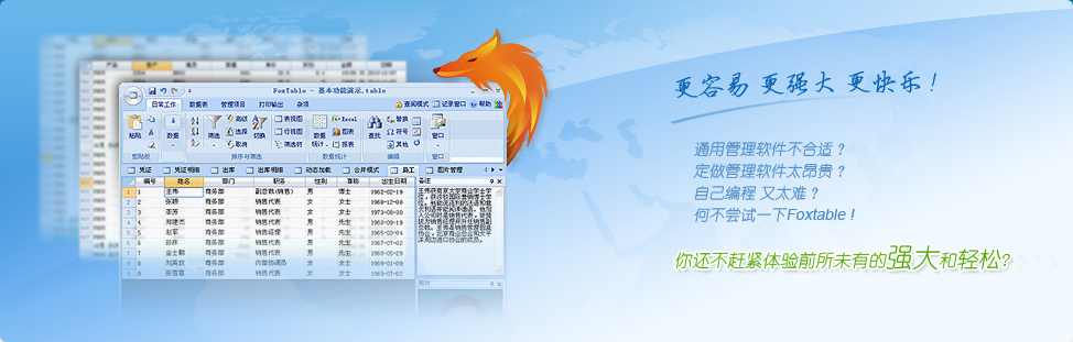 如果有人告訴你,有這樣一款軟件,不管你有沒有基礎(chǔ),只需一周左右的時間就能讓你成為一個數(shù)據(jù)管理高手,而且其數(shù)據(jù)錄入之快捷、統(tǒng)計查詢之強大、報表輸出之多樣,目前市面上的軟件無出其右;同時只要你愿意,它可以立即變身為一個開發(fā)平臺,而且從PC到手機、從C/S到B/S、從客戶端到服務(wù)端、從單機到局域網(wǎng)再到互聯(lián)網(wǎng)、從常規(guī)的數(shù)據(jù)管理到文檔管理、從單業(yè)務(wù)管理系統(tǒng)到企業(yè)整套ERP,包括企業(yè)IM,它都能勝任開發(fā),并且可以編譯成獨立的可執(zhí)行文件。它不僅簡單,而且高效,高效到一人可抵一個小團隊;它能讓一個完全沒有接觸過編程的職場菜鳥,在3個月甚至更短的時間內(nèi)蛻變?yōu)橐粋€管理軟件開發(fā)的全棧工程師。你可能不會相信,真的有這樣的軟件嗎?有,就是Foxtable!Foxtable將Excel、Access、Foxpro、VB以及易表的優(yōu)勢融合在一起,無論是數(shù)據(jù)錄入、查詢、統(tǒng)計,還是報表生成,都前所未有的強大和易用,普通用戶無需編寫任何代碼,即可輕松完成復(fù)雜的數(shù)據(jù)管理工作,真正做到拿來即用。同時Foxtable又是一個高效開發(fā)工具,專門針對數(shù)據(jù)管理軟件的開發(fā)作了大量的優(yōu)化,使得用戶在開發(fā)過程中只需關(guān)注商業(yè)邏輯, 無需糾纏于具體功能的實現(xiàn),這樣Foxtable不僅開發(fā)效率十倍于其他專業(yè)開發(fā)工具,而且更加易用,幾乎人人都能掌握。讓普通人開發(fā)出專業(yè)水準(zhǔn)的管理軟件,以前是一個不可思議的想法,而Foxtable的出現(xiàn),讓這成為現(xiàn)實。而且Foxtable內(nèi)置了HTTP服務(wù)和手機網(wǎng)頁生成功能,用戶不需要任何專業(yè)知識,甚至可以完全不懂網(wǎng)頁設(shè)計,也能快速開發(fā)出手機端的管理軟件。此外,F(xiàn)oxtable不僅內(nèi)建數(shù)據(jù)庫,還支持Access、SQL Server、Oracle等主流數(shù)據(jù)庫作為外部數(shù)據(jù)源,并提供了數(shù)據(jù)動態(tài)加載、后臺統(tǒng)計等功能,使得相距千里的不同電腦協(xié)同處理數(shù)據(jù),以及海量數(shù)據(jù)管理,非專業(yè)人士也能輕松應(yīng)付,從而讓普通人也能快速開發(fā)出各種基于互聯(lián)網(wǎng)的管理系統(tǒng),如進銷存、MRP、ERP、OA、CRM、SCM、MIS系統(tǒng)等等。不僅如此,F(xiàn)oxTable還同時具備B/S和C/S架構(gòu)的優(yōu)勢,可以像B/S軟件一樣易于部署,同時又具備C/S軟件良好的用戶體驗和交互性。經(jīng)過十年的發(fā)展,目前國內(nèi)已經(jīng)有數(shù)萬企事業(yè)單位成功利用Foxtable自行開發(fā)管理系統(tǒng),不再受制于軟件公司,不少單位節(jié)省了以十萬甚至百萬計算的費用;同時也發(fā)展了一大批個人愛好者,這些愛好者很多都是企業(yè)管理人員,熟悉管理和業(yè)務(wù)邏輯,以前苦于沒有合適的開發(fā)工具,無法根據(jù)自己的需要自行開發(fā)系統(tǒng),F(xiàn)oxtable的出現(xiàn),讓他們?nèi)缁⑻硪恚娂婇_發(fā)出適合自己企業(yè)的管理軟件,讓領(lǐng)導(dǎo)和同事刮目相看,大大提高了自己在職場的競爭實力,一些用戶因此改變了自己的職業(yè)生涯甚至人生。 [ + 展開 ]